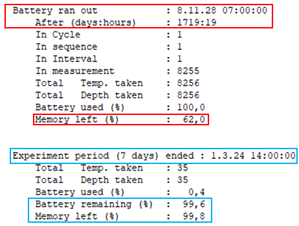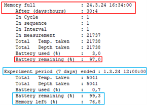 - Blue boxes: If the 'Battery and memory calculator (days)' option was used, you can also find how much battery and memory is used for a selected period. Those findings are shown within the blue boxes.