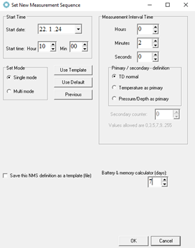 Once you have completed the setup and pushed 'OK', a new measurement sequence (NMS) file opens. It includes calculations for battery and memory usage based on your setup.