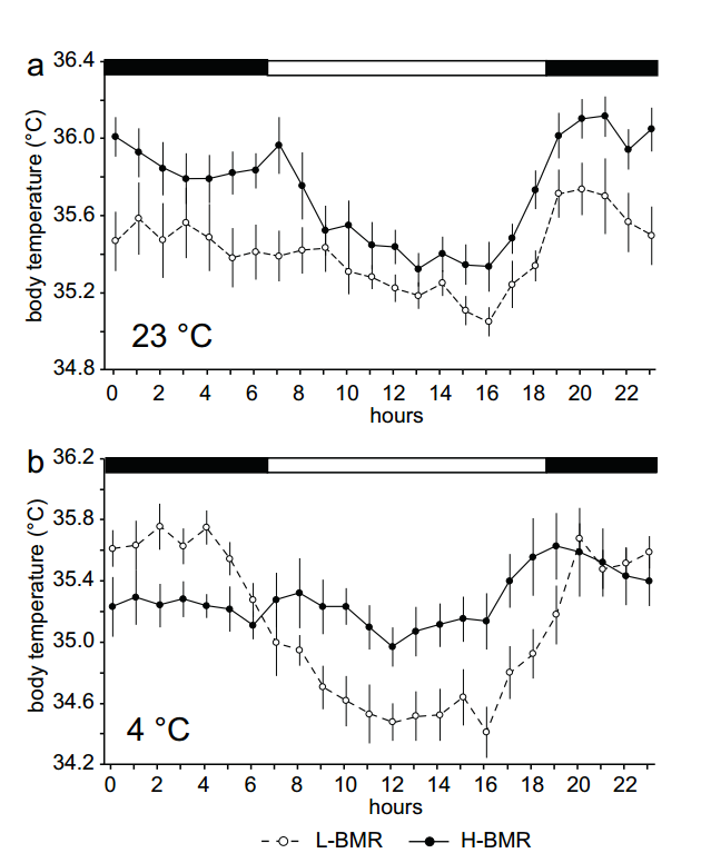 A recent study compared laboratory mice selectively bred for high or low BMR to investigate how variation in metabolic rate interacts with thermoregulation under different environmental conditions. Scientists from the University of Białystok, Poland, implanted 18 male mice, randomly chosen from each line, nine from low BMR (L-BMR) and nine from high BMR (H-BMR) with Star-Oddi’s DST nano-T temperature loggers. The loggers were implanted intra-peritoneally and set to measure core body temperature every 10 minutes for the length of the study. The mice were kept at ambient temperature of 23°C and then moved to 4°C to acclimatize for few weeks. The researchers then chose two 72h periods to quantify the body temperature of the mice (See fig. 1 below).