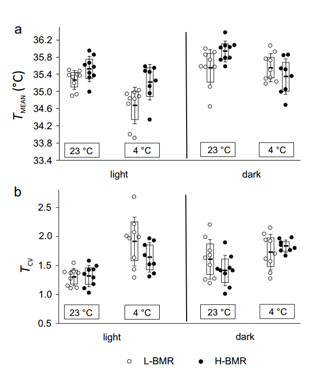 Artificial selection of BMR causes a 60% higher BMR in H-BMR male mice over their L-BMR counterpart. This resulted in a 0.32 °C body temperature difference at 23 °C, which disappeared at 4 °C and was lower than expected. This suggests that while BMR variation can influence body temperature and fat content, their relationship is flexible and context-dependent. Therefore, the authors’ conclusion is in a few words: BMR should always be considered in studies of body temperature and other physiological and metabolic traits like obesity.