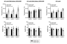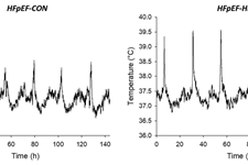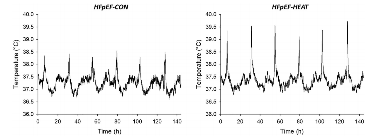 A total of 20 rats were implanted with Star-Oddi’s DST micro-ACT. The physio loggers were set to measure core body temperature every 3-4 minutes and activity every 7 minutes over 8 weeks. Data from weeks 2, 4 and 6 are used in the article. The rats were HFpEF obese male rats and 10 underwent heat therapy (HFpET-HEAT) and 10 were control rats (HFpET-CON). The heat therapy consisted of exposing the rats to 39°C daily and during daytime for gradual increase from 5 to 20 min over the course of the experiment. Core temperature from week 6 is shown below in fig. 2 from the article.