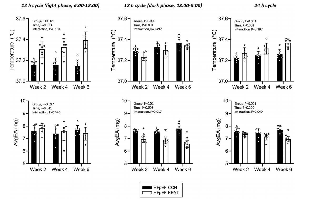Across light and dark cycles, rats receiving heat therapy (HFpEF-HEAT) maintained higher core temperatures than controls during the light phase and over 24 hours, but slightly lower temperatures at night as shown in fig. 6 from the article below. Physical activity was similar between groups during the light phase, but HFpEF-HEAT rats showed reduced activity during the dark phase, and activity decreased further as heat therapy duration increased.